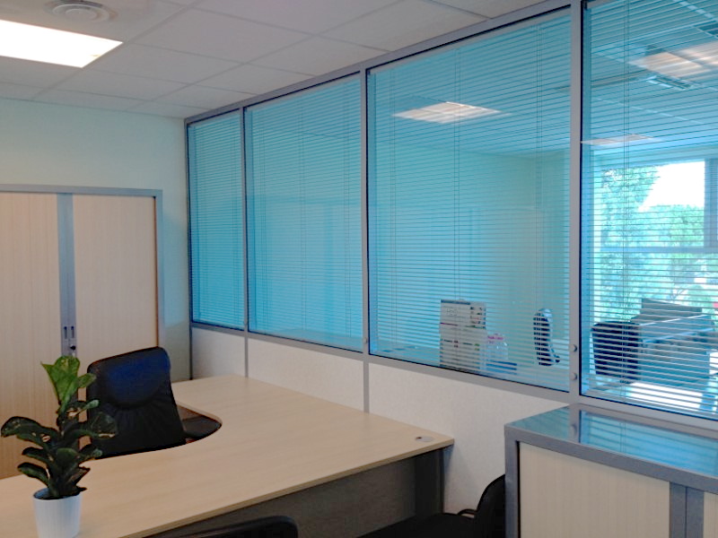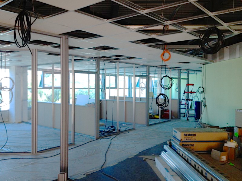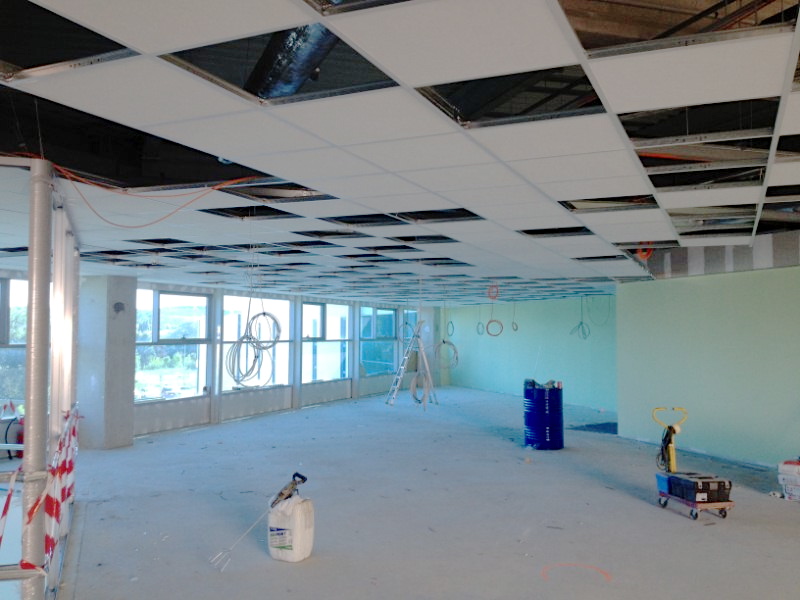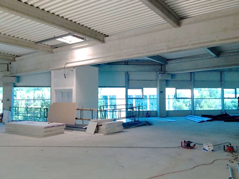 Nous avons réalisé les travaux de platrerie (doublage et cloisons des sanitaires), les cloisons de bureaux sur ossature aluminium, les faux plafonds démontables, les revêtements de sol type lino, la peinture et le câblage électrique et informatique.